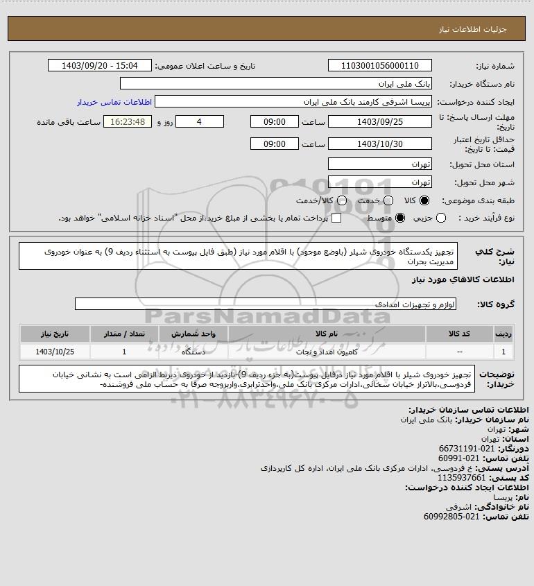 شرح کلی نیاز: تجهیز یکدستگاه خودروی شیلر (باوضع موجود) با اقلام مورد نیاز (طبق فایل پیوست به استثناء ردیف 9) به عنوان خودروی مدیریت بحران