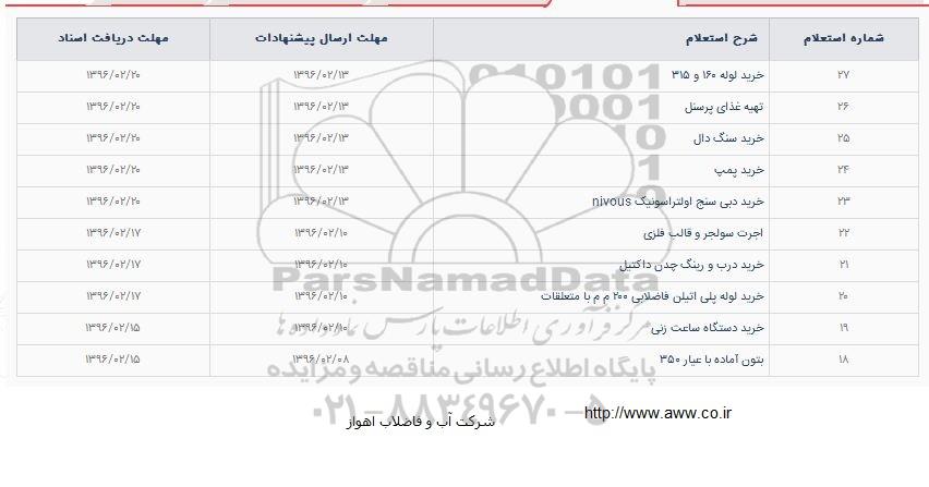 استعلام بها و موضوع استعلام استعلام خرید لوله 160 و 315 و ... به اطلاع کلیه شرکتها و افراد متخصص واجد شرایط میرساند، آگهی گذار در نظر دارد از طریق استعلام بها، نسبت به انتخاب و دریافت پیشنهادات اقدام نماید. این استعلام با کد آگهی ثبت شده در سامانه خبرگزاری پارس نماد : 839164 منتشر شده است. مشخصات استعلام : تاریخ شروع استعلام: 1396/02/10 آخرین مهلت ارسال پیشنهاد قیمت : 1396/02/20 و محل اجرای پروژه : استان خوزستان میباشد. استعلام قیمت مورد درخواست : استعلام خرید لوله 160 و 315 و ... با دستهبندیهای تخصصی و گروه های مرتبط : ابزار دقیق, الکتروموتور و پمپ های شناور, بتن ریزی, تجهیزات آب و فاضلاب, صنایع ریخته گری, طبخ غذا, قطعات بتنی, قطعات چدنی و فولادی, قالب های لغزنده, کنتور آب, لوله و اتصالات, دستگاه های کارت خوان و بارکد خوان, مصالح ساختمانی, استعلام اطلاع رسانی میگردد.