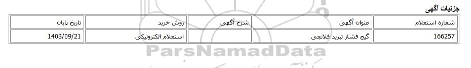 | 166257 | گیج فشار تبرید فلانچی | استعلام الکترونیکی | 1403/09/21 |