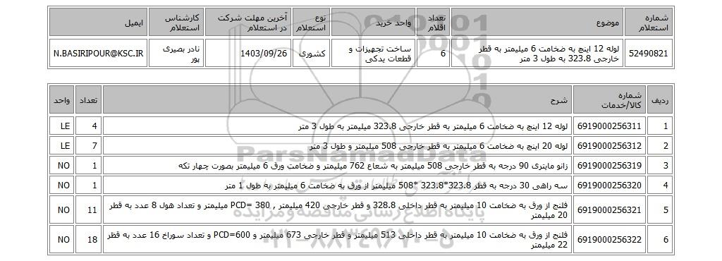 | 52490821 | لوله 12 اینچ به ضخامت 6 میلیمتر به قطر خارجی 323.8 به طول 3 متر | 6 | ساخت تجهیزات و قطعات یدکی | کشوری | 1403/09/26 | نادر بصیری پور | N.BASIRIPOUR@KSC.IR |