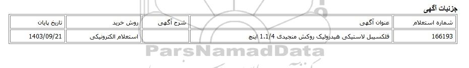 | 166193 | فلکسیبل لاستیکی هیدرولیک روکش منجیدی 1.1/4 اینچ | استعلام الکترونیکی | 1403/09/21 |