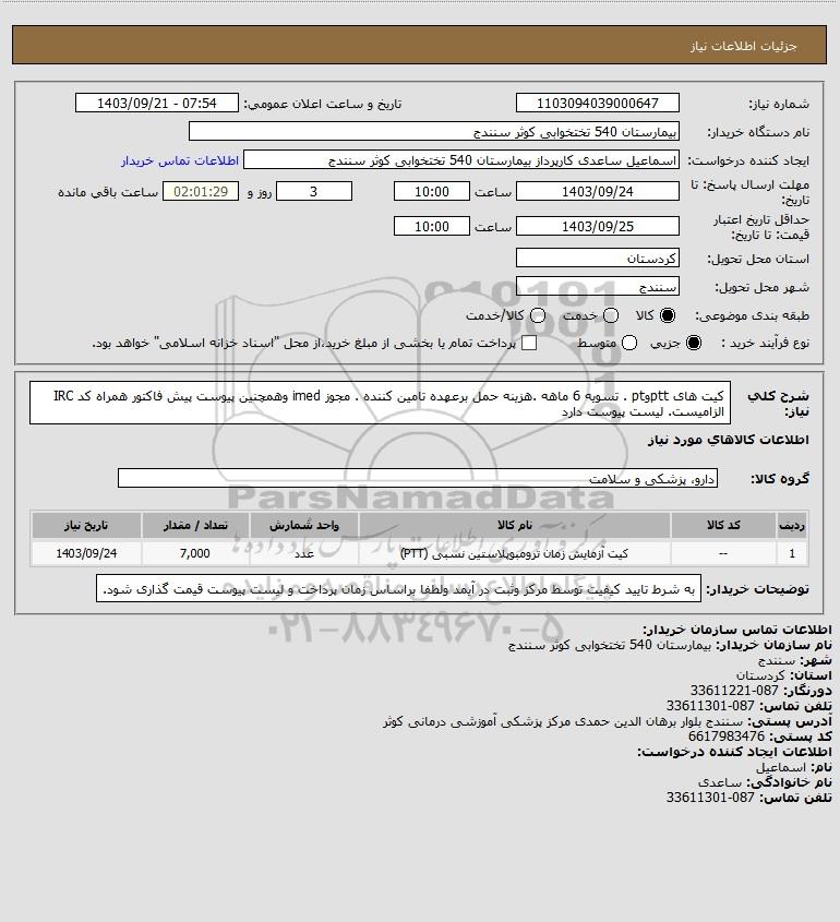 شرح کلی نیاز: کیت های pttوpt . تسویه 6 ماهه .هزینه حمل برعهده تامین کننده . مجوز imed وهمچنین پیوست پیش فاکتور همراه کد IRC الزامیست. لیست پیوست دارد