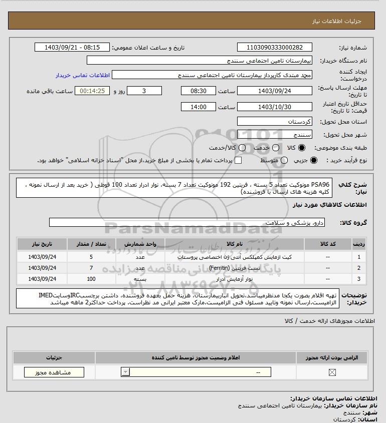 شرح کلی نیاز: PSA96 مونوکیت تعداد 5 بسته ، فریتین 192 مونوکیت تعداد 7 بسته، نوار ادرار تعداد 100 قوطی ( خرید بعد از ارسال نمونه ، کلیه هزینه های ارسال با فروشنده)