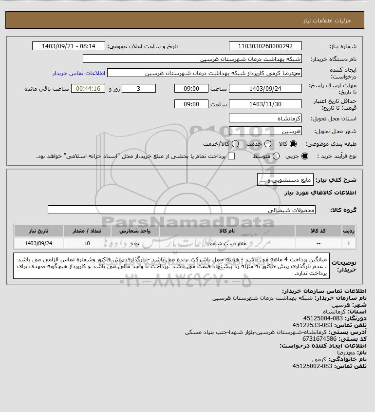 | 1 | -- | مایع دست شویی | عدد | 10 | 1403/09/24 |