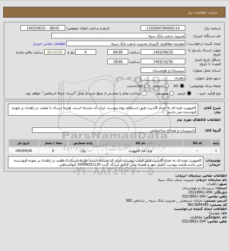 توضیحات خریدار:کامپوزیت نقره ای به تعداد 8شیت طبق فرمت پیوست، ایران کد مشابه است. هزینه ارسال تا مقصد در زاهدان بر عهده فروشنده می باشد.فرمت پیوست تکمیل مهر و همراه پیش فاکتور ارسال گردد 05499251130 جهانشاهی