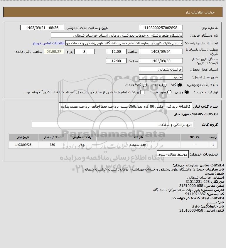 شرح کلی نیاز: کاغذA4 برند کپی مکس 80 گرم تعداد360 بسته