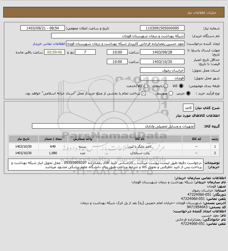 نام سازمان خریدار: شبکه بهداشت و درمان شهرستان قوچان