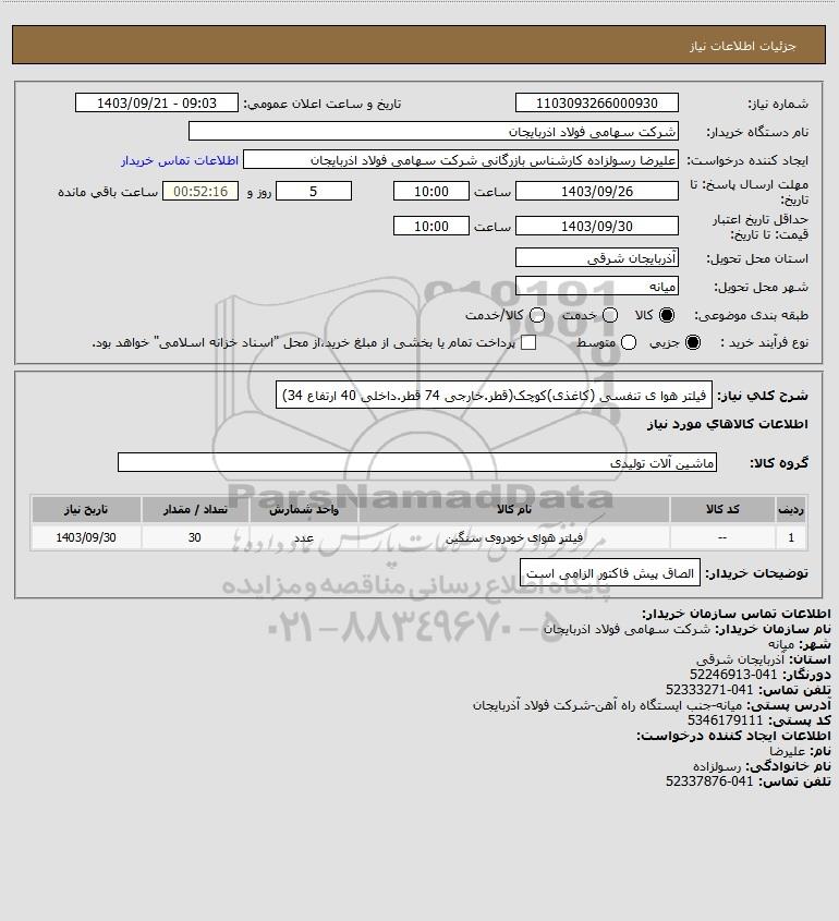 شرح کلی نیاز: فیلتر هوا ی تنفسی (کاغذی)کوچک(قطر.خارجی 74 قطر.داخلی 40 ارتفاع 34)