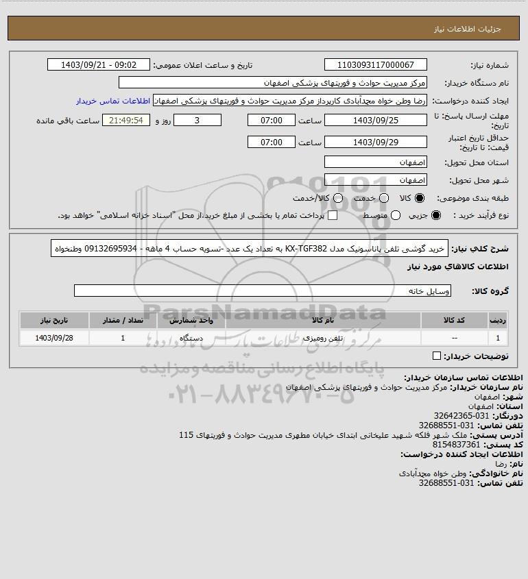 شرح کلی نیاز: خرید گوشی تلفن پاناسونیک مدل KX-TGF382 به تعداد یک عدد -تسویه حساب 4 ماهه - 09132695934 وطنخواه
