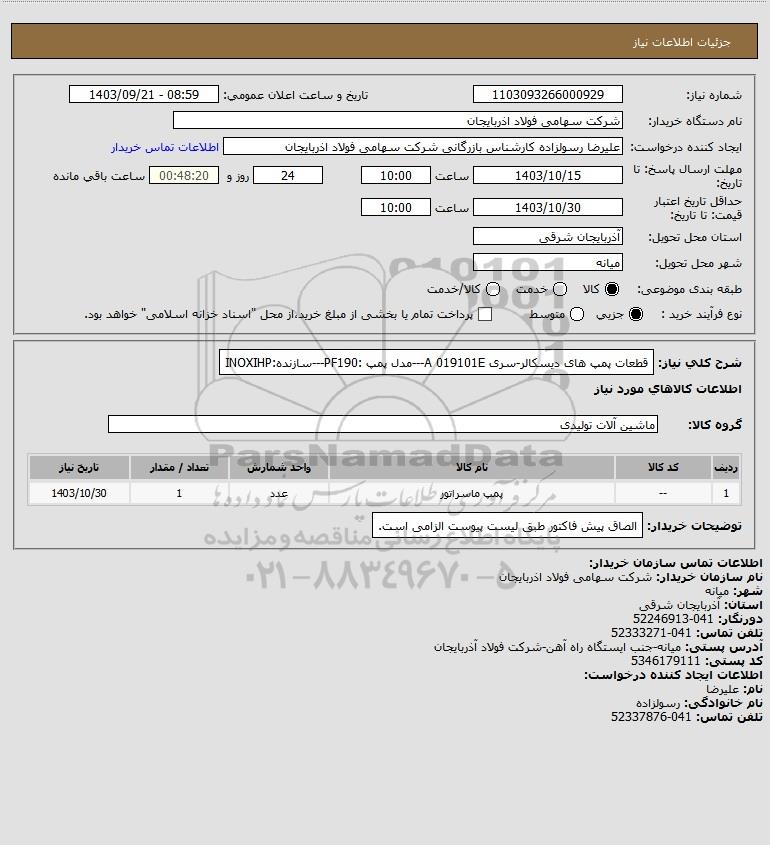 شرح کلی نیاز: قطعات پمپ های دیسکالر-سری A 019101E---مدل پمپ :PF190---سازنده:INOXIHP