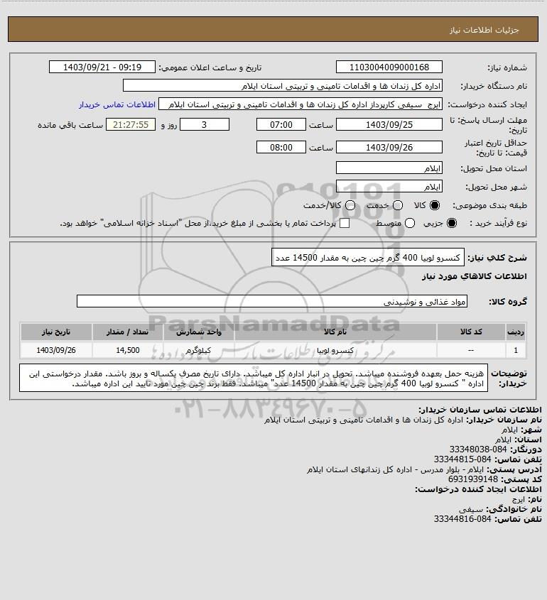 شرح کلی نیاز: کنسرو لوبیا 400 گرم چین چین به مقدار 14500 عدد