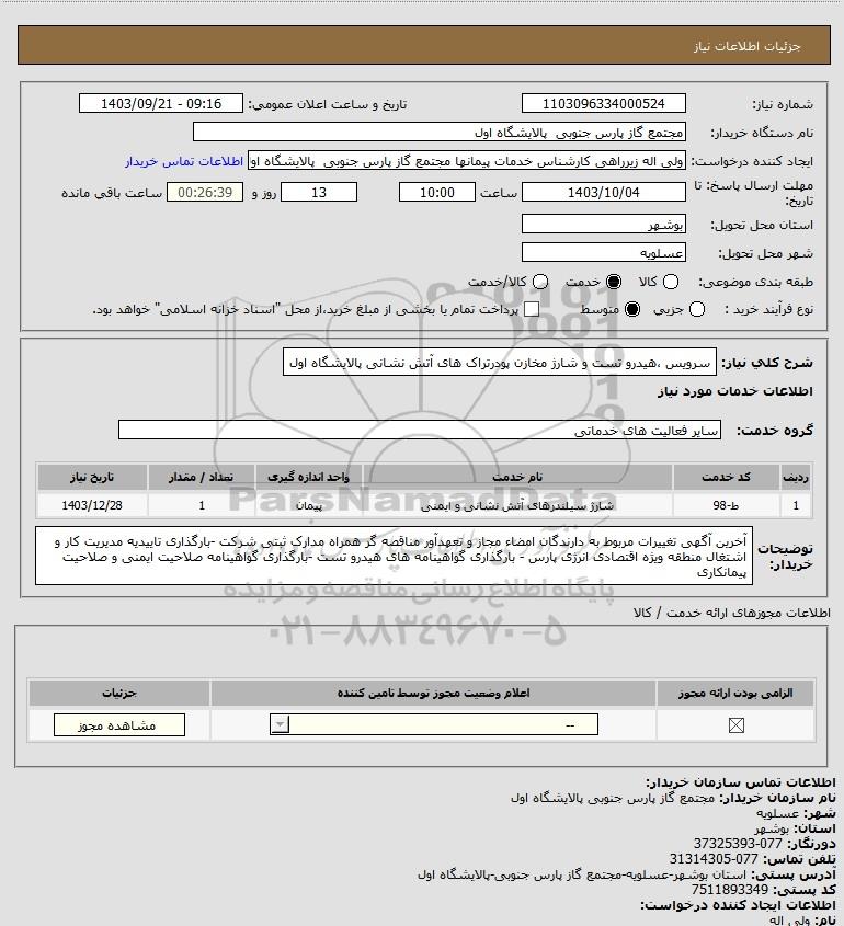 استعلام سرویس هیدرو تست و شارژ مخازن پودرتراک های آتش نشانی پالایشگاه اول, استعلام سرویس ،هیدرو تست و شارژ مخازن پودرتراک های آتش نشانی پالایشگاه اول
