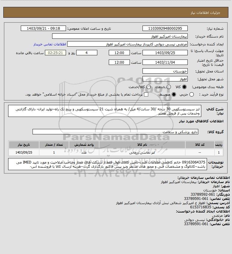 شرح کلی نیاز: لنز سیستوسکوپی 30 درجه /30 سانت/4 میل/ به همراه شیت 21 سیستوسکوپی و بریج تک راه--تولید ایران- دارای گارانتی وخدمات پس از فروش معتبر