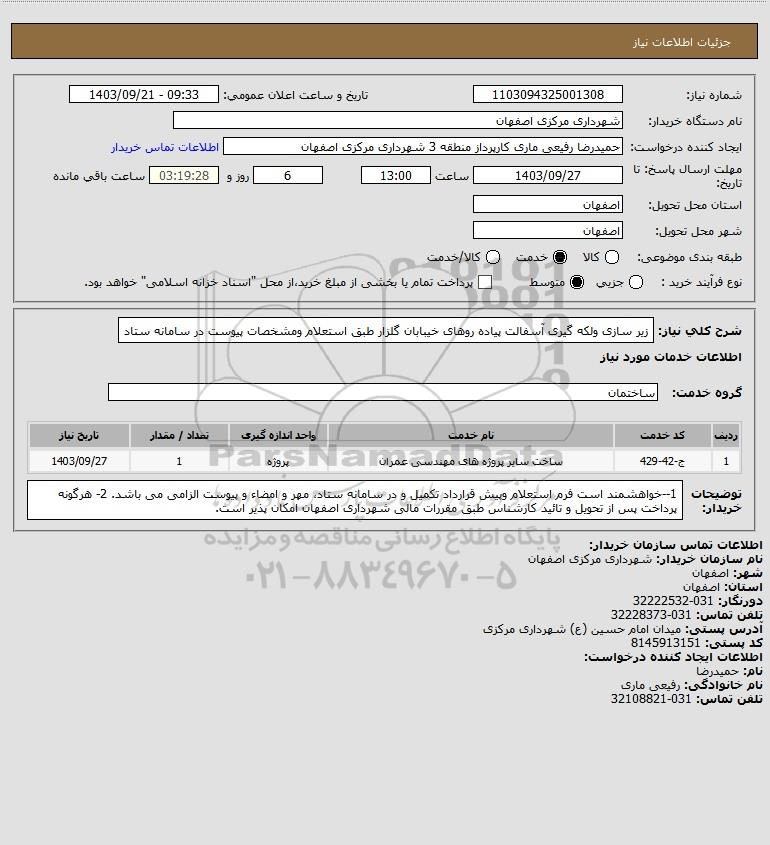 شرح کلی نیاز: زیر سازی ولکه گیری آسفالت پیاده روهای خیبابان گلزار طبق استعلام ومشخصات پیوست در سامانه ستاد