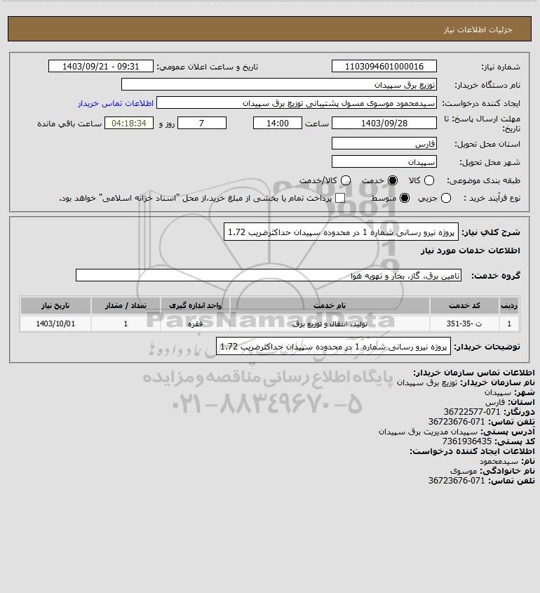 شرح کلی نیاز: پروژه نیرو رسانی شماره 1 در محدوده سپیدان حداکثرضریب 1.72
