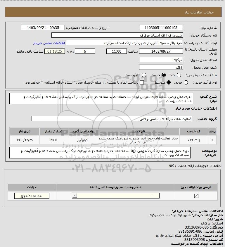 شرح کلی نیاز: تهیه،حمل ونصب سازه فلزی تقویتی ایوان ساختمان جدید منطقه دو شهرداری اراک براساس نقشه ها و آنالیزقیمت و مستندات پیوست