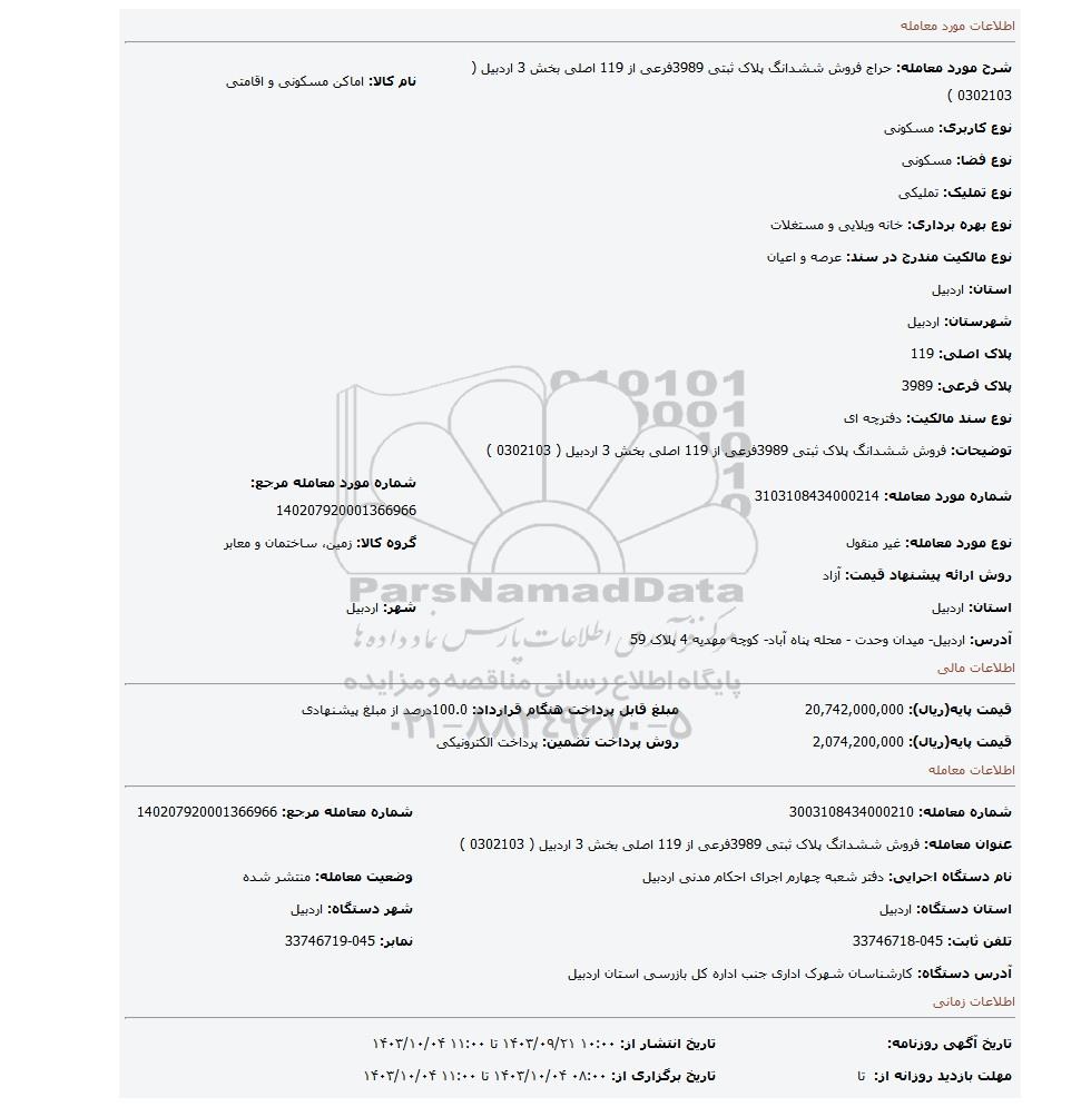 شرح مورد معامله: حراج فروش ششدانگ پلاک ثبتی 3989فرعی از 119 اصلی بخش 3 اردبیل ( 0302103 ) | نام کالا: اماکن مسکونی و اقامتی | |