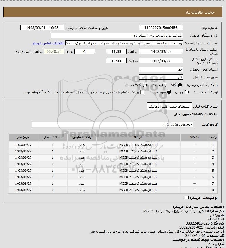 | 8 | -- | کلید اتوماتیک کامپکت MCCB | عدد | 1 | 1403/09/27 |