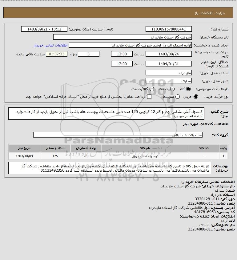 شرح کلی نیاز: کپسول آتش نشانی پودر و گاز 12 کیلویی 125 عدد
