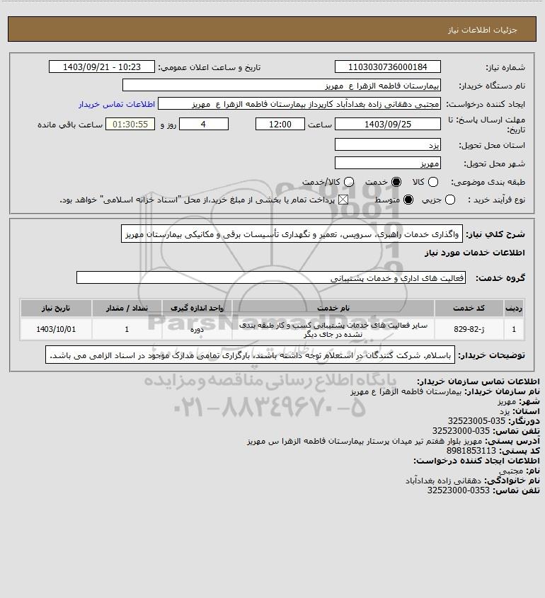 شرح کلی نیاز: واگذاری خدمات راهبری، سرویس، تعمیر و نگهداری تأسیسات برقی و مکانیکی بیمارستان مهریز