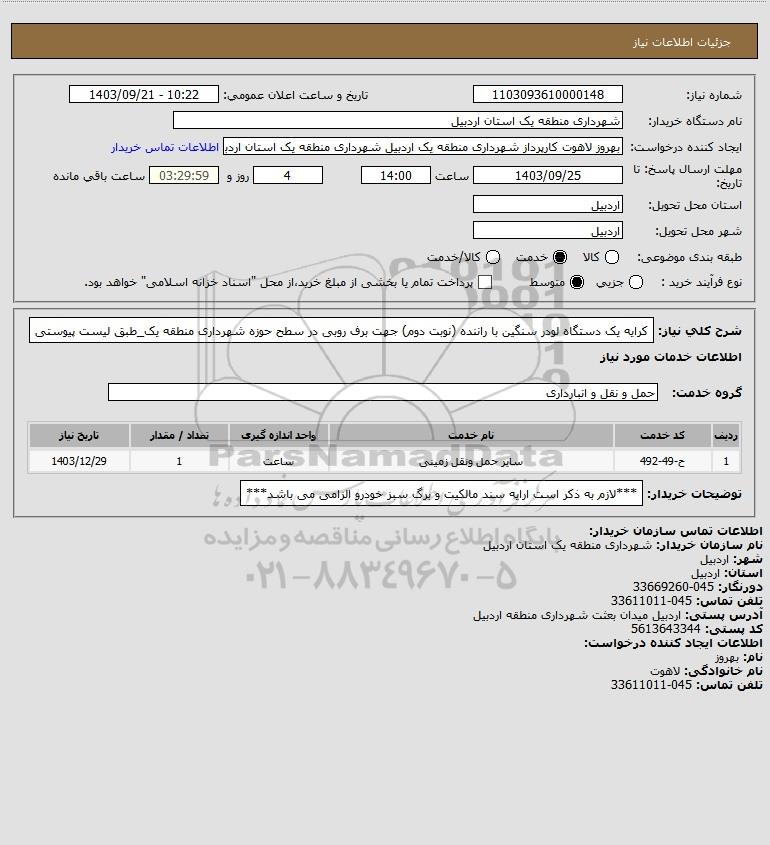 شرح کلی نیاز: کرایه یک دستگاه لودر سنگین با راننده (نوبت دوم) جهت برف روبی در سطح حوزه شهرداری منطقه یک_طبق لیست پیوستی
