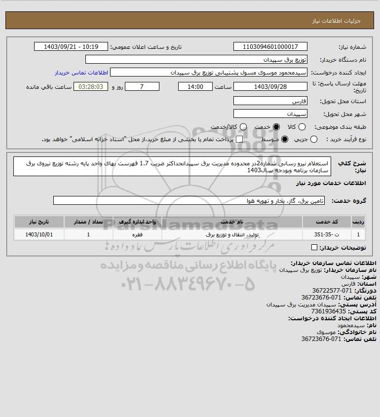 شرح کلی نیاز: استعلام نیرو رسانی شماره2در محدوده مدیریت برق سپیدانحداکثر ضریب 1.7