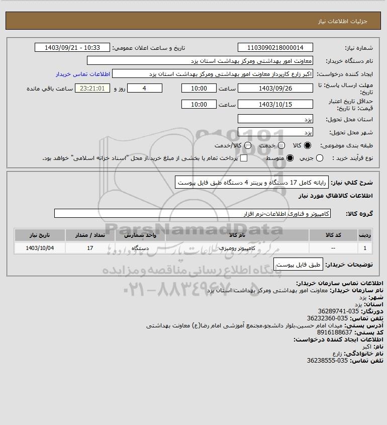شرح کلی نیاز: رایانه کامل 17 دستگاه و پرینتر 4 دستگاه طبق فایل پیوست