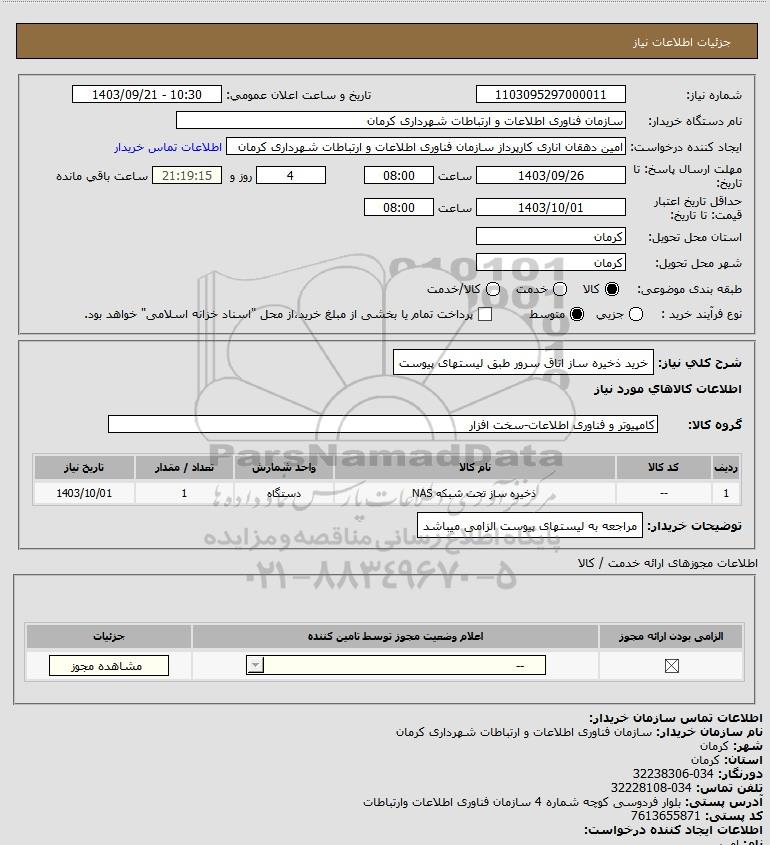نام دستگاه خریدار:سازمان فناوری اطلاعات و ارتباطات شهرداری کرمان
