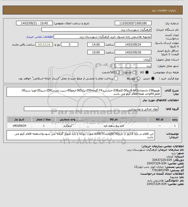توضیحات خریدار:این اقلام در بازه 15روز از تاریخ8/16لغایت08/31به صورت روزانه و تازه تحویل گرفته می شود.واحدهمه اقلام کیلو می باشد