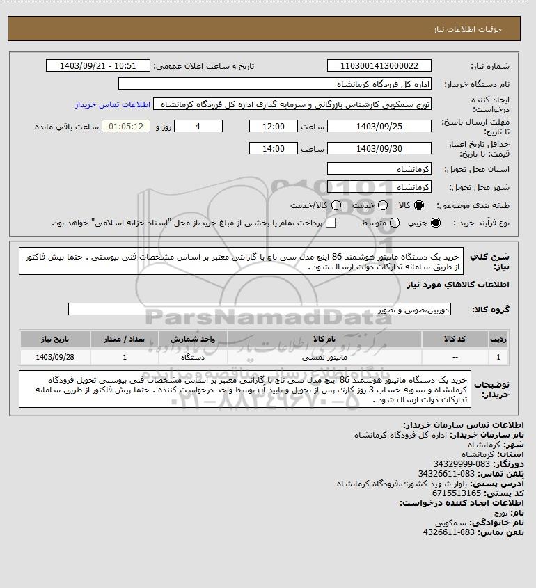شرح کلی نیاز: خرید یک دستگاه مانیتور هوشمند 86 اینچ مدل سی تاچ با گارانتی معتبر بر اساس مشخصات فنی پیوستی . حتما پیش فاکتور از طریق سامانه تدارکات دولت ارسال شود .