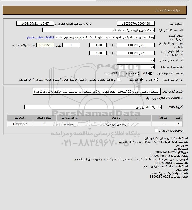 شرح کلی نیاز: استعلام ترانس جریان 20 کیلوولت (لطفا مطابق با فرم استعلام در پیوست پیش فاکتور بارگزاری گردد.)