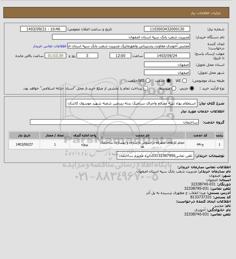 شرح کلی نیاز: استعلام بهاء تهیه مصالح واجرای سرامیک بدنه زیرزمین شعبه شهید موسوی کاشان