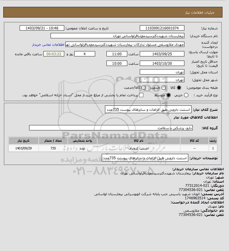 شرح کلی نیاز: استنت دارویی طبق الزامات و سایزهای پیوست 735عدد