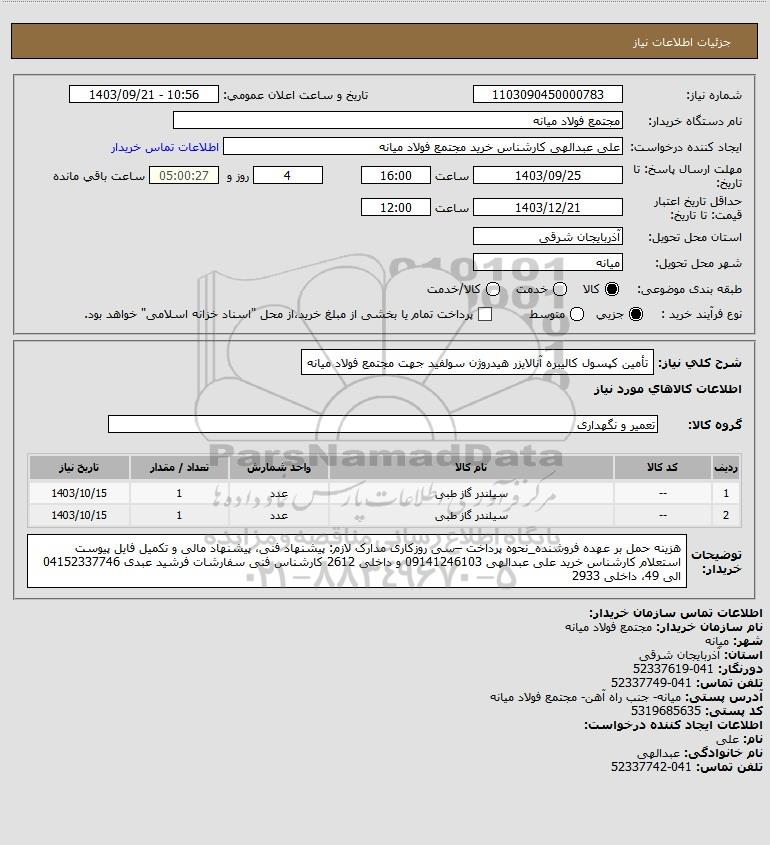 | 2 | -- | سیلندر گاز طبی | عدد | 1 | 1403/10/15 |