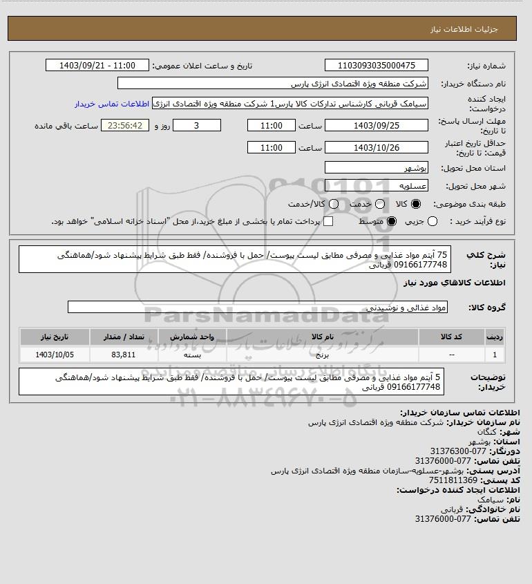 شرح کلی نیاز: 75 آیتم مواد غذایی و مصرفی مطابق لیست پیوست/ حمل با فروشنده/ فقط طبق شرایط پیشنهاد شود/هماهنگی 09166177748 قربانی
