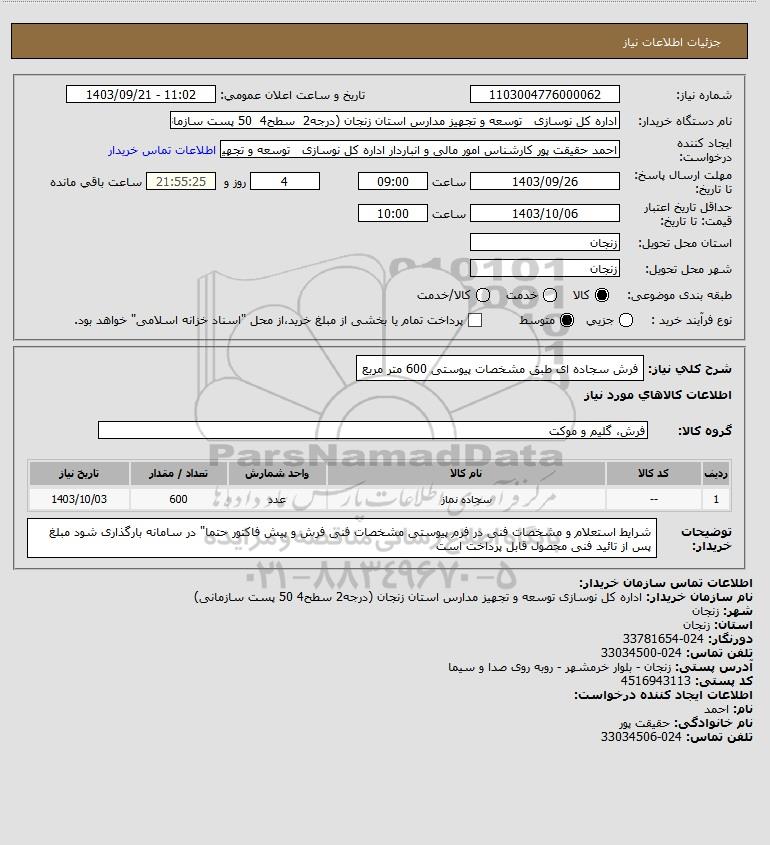 نام دستگاه خریدار:اداره کل نوسازی توسعه و تجهیز مدارس استان زنجان (درجه2 سطح4 50 پست سازمانی)