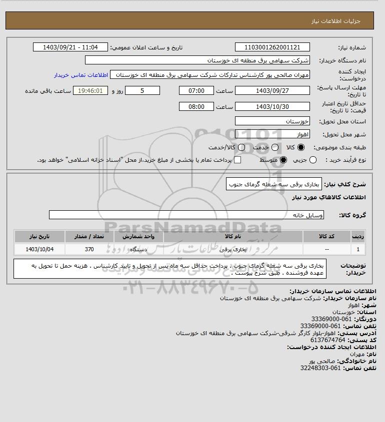 شرح کلی نیاز: بخاری برقی سه شعله گرمای جنوب