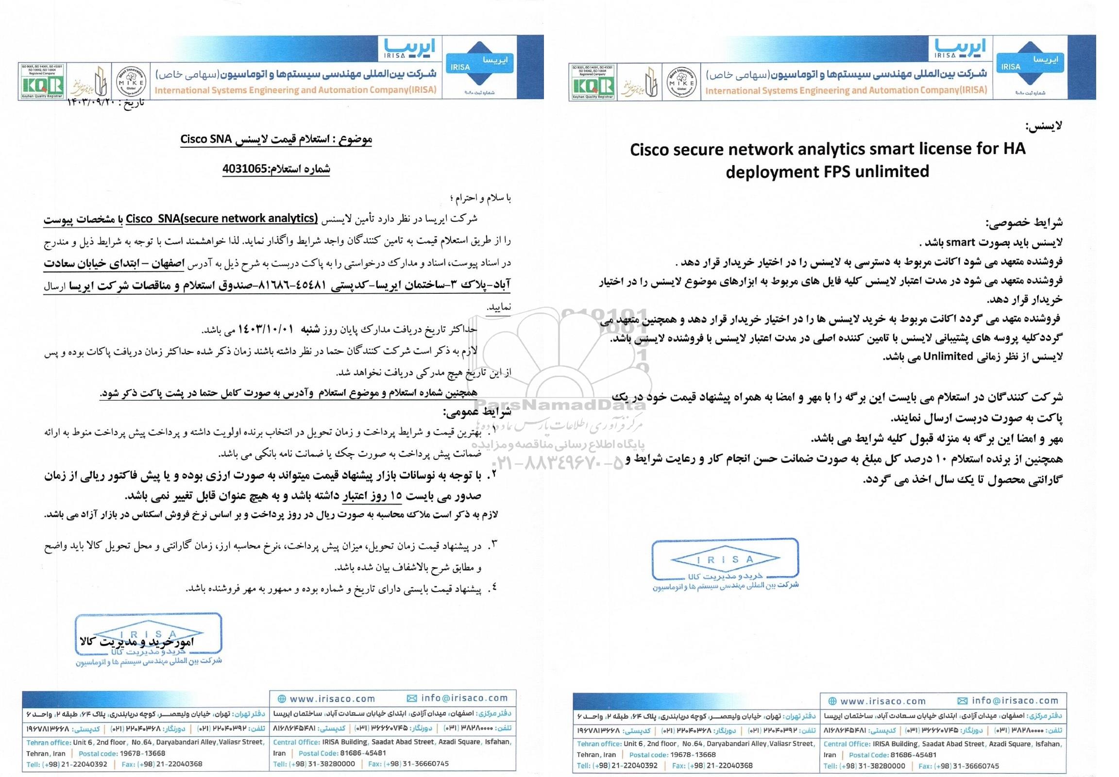 شرکت ایریسا در نظر دارد تامین لایسنس (Cisco SNA(secure network analytics با مشخصات پیوست را از طریق استعلام قیمت به تامین کنندگان واجد شرایط واگذار نماید. لذا خواهشمند است با توجه به شرایط ذیل و مندرج در اسناد پیوست، اسناد و مدارک درخواستی را به پاکت دربست به شرح ذیل به آدرس اصفهان - ابتدای خیابان سعادت آباد - پلاک 3- ساختمان ایریسا - کدپستی 45481 - 81686 - صندوق استعلام و مناقصات شرکت ایریسا ارسال نمایید.