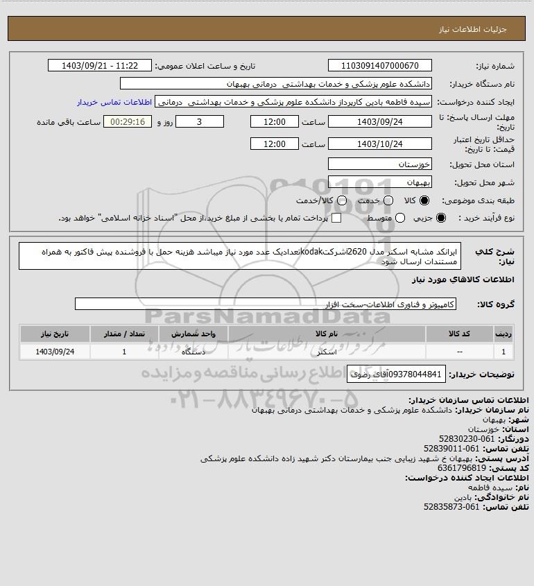 شرح کلی نیاز: ایرانکد مشابه اسکنر مدل i2620شرکتkodakتعدادیک عدد مورد نیاز میباشد هزینه حمل با فروشنده پیش فاکتور به همراه مستندات ارسال شود