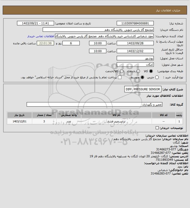 شرح کلی نیاز: DIFF. PRESSURE SENSOR
