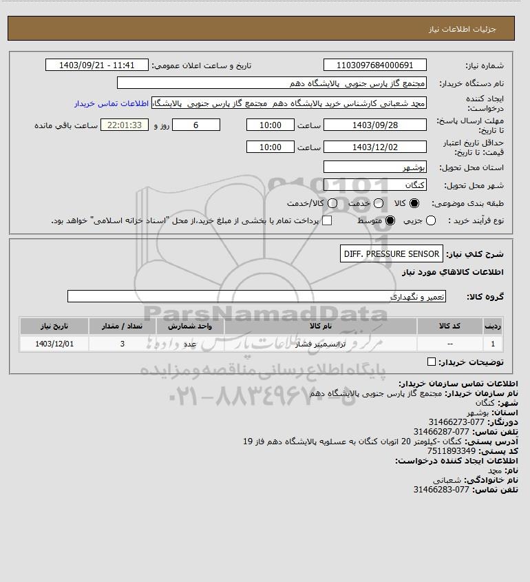 شرح کلی نیاز: DIFF. PRESSURE SENSOR