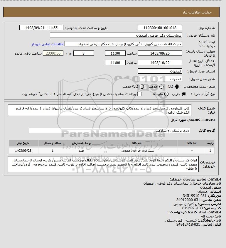 شرح کلی نیاز: کاپ کلپوتومی 3 سانتیمتر تعداد 2 عدد/کاپ کلپوتومی 2.5 سانتیمتر تعداد 2 عدد/هندل مانیپولار تعداد 1 عدد/ارایه فاکتور الکترونیک الزامی