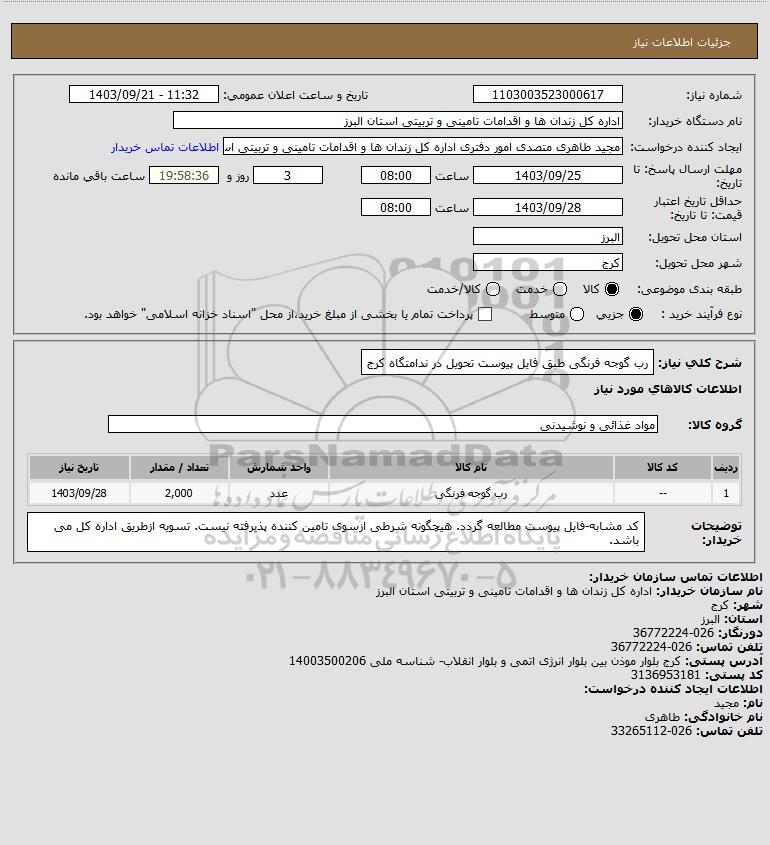 استعلام رب گوجه فرنگی طبق فایل پیوست تحویل در ندامتگاه کرج, استعلام رب گوجه فرنگی طبق فایل پیوست تحویل در ندامتگاه کرج