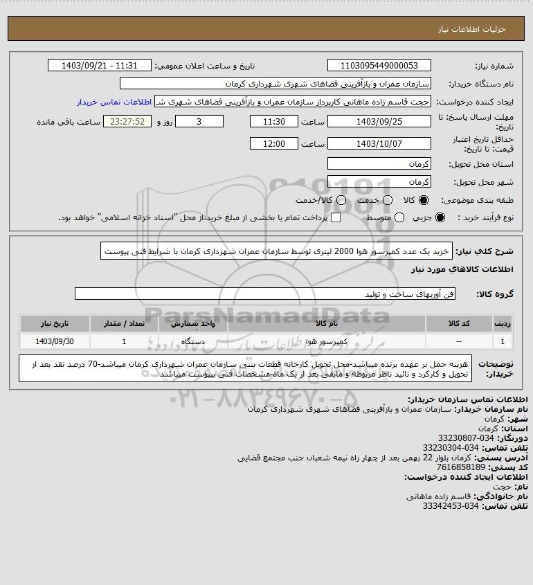 شرح کلی نیاز: خرید یک عدد کمپرسور هوا 2000 لیتری توسط سازمان عمران شهرداری کرمان با شرایط فنی پیوست