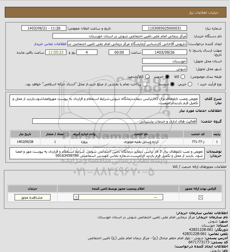 شرح کلی نیاز: تعویض ونصب تابلوهای برق 3فازترانس دیمانددرمانگاه شوش،شرایط استعلام و قرارداد به پیوست مهروامضاشود.بازدید از محل و تکمیل فرم بازدیدالزامیست.