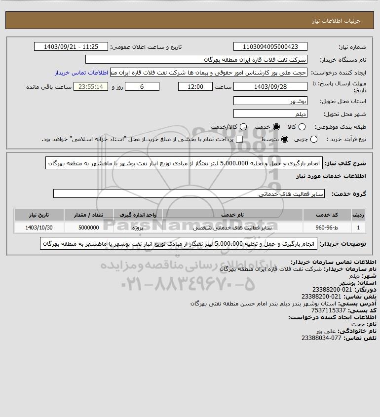شرح کلی نیاز: انجام بارگیری و حمل و تخلیه 5.000.000 لیتر نفتگاز از مبادی توزیع انبار نفت بوشهر یا ماهشهر به منطقه بهرگان