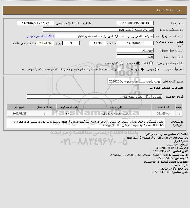 نام دستگاه خریدار:امور برق منطقه 2 شهر اهواز