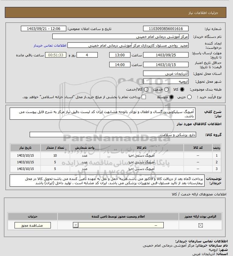 شرح کلی نیاز: آمبوبگ سیلیکونی بزرگسال و اطفال و نوزاد. باتوجه مشابهت ایران کد لیست دقیق نیاز مرکز به شرح فایل پیوست می باشد.