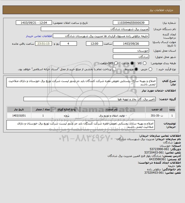 توضیحات خریدار:اصلاح و بهینه سازی روستایی تعویض مقره شرکت کنندگان باید جز وندور لیست شرکت توزیع برق خوزستان و دارای صلاحیت ایمنی باشند