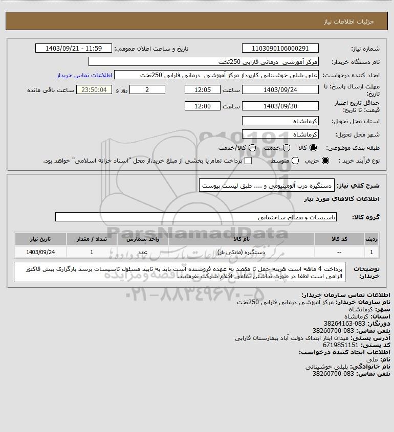 شرح کلی نیاز: دستگیره درب آلومینیومی و .... طبق لیست پیوست